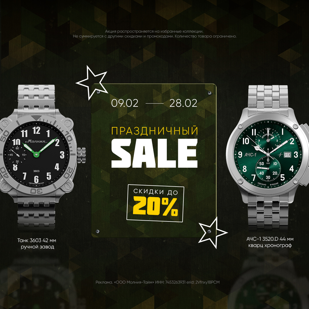До конца февраля в интернет-магазине часовой мануфактуры «Молния» — праздничная распродажа! Это отличный шанс приобрести в подарок на 14 февраля, 23 февраля и 8 марта по супервыгодной цене часы от «Молнии». Скидка -20% действует на коллекции Танк, АЧС-1, HYRON, Беркут, Evolution, Green Ray, Этюд, Жемчуг, Energy 3.1. В дизайне часов коллекции «Беркут» угадывается дух пилотских хронографов: четкость показаний обеспечивают крупные рельефные цифры, широкие стрелки и покрытие Super-LumiNova, гарантирующее яркую подсветку в темноте. Скидка -20% действует на модели коллекции на мануфактурном механизме 3603 действует и на модели на механизме Miyota 8215 c автоподзаводом и календарем. Дополнительно — со скидкой -15% — можно приобрести интегрированный браслет из нержавеющей стали с крупными звеньями и логотипом мануфактуры на застежке. Жемчуг 715 36 мм кварц — элегантные женские часы, идеальный акцент как для делового образа, так и для вечернего выхода, подчеркивающий стиль и безупречный вкус св