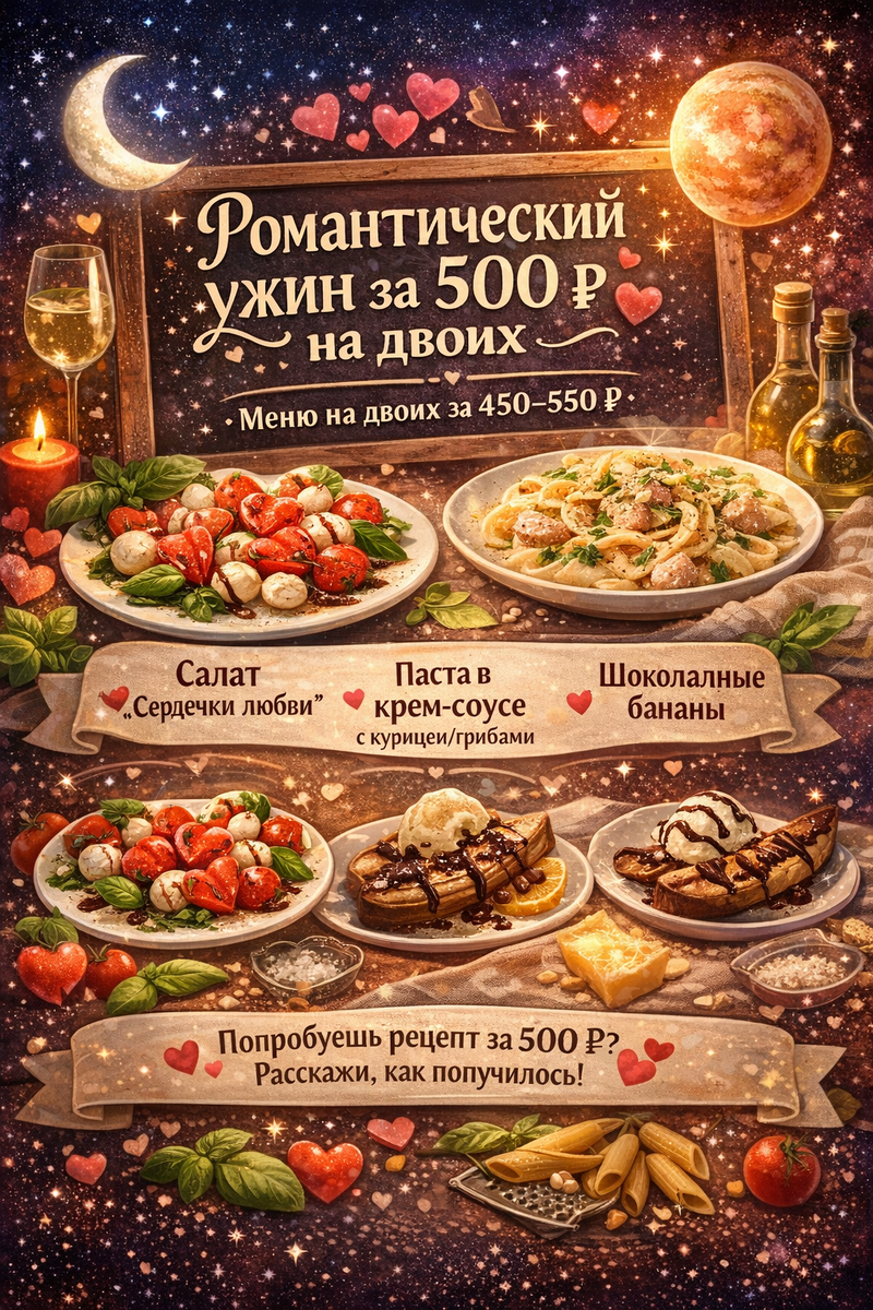 Привет, мои уютные кулинары! 🌙 Венера в Рыбах делает вечер мечтательным — самое время потренировать романтический ужин дома. Не ресторан за 5000, а нежный вечер за 500 ₽ на двоих (продукты из ближайшего магазина). Готовим сегодня, чтобы 14 февраля не суетиться. Меню: салат-сердечко + паста с крем-соусом + лёгкий десерт. Всё быстро, вкусно и атмосферно! Меню на двоих (общая стоимость ~450–550 ₽): Советы от звёзд: