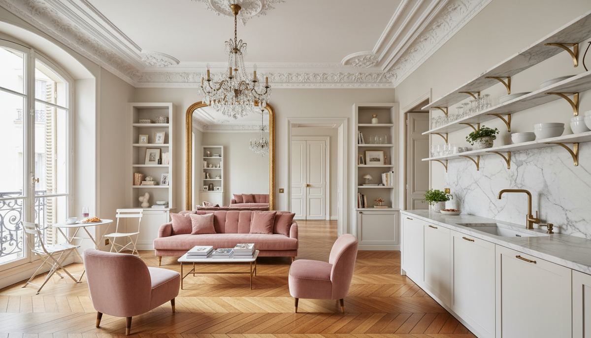 - Бархатные акценты: Включение мягкой мебели, например, дивана в цвете «пыльная роза» или уютных кресел, смягчает строгость кухонных линий.