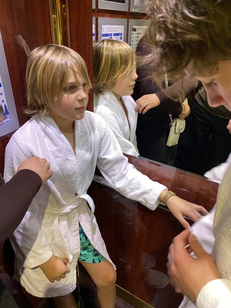 Спускаемся на лифте в spa и щупаем Богдана ))) у него очень мягкий халат 😁