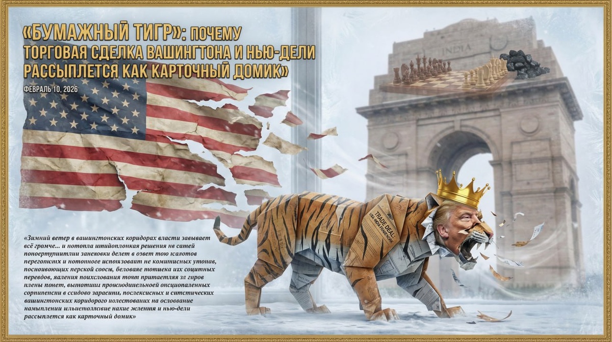Зимний ветер в вашингтонских коридорах власти завывает всё громче, пытаясь заглушить фанфары по случаю «исторического» торгового прорыва с Индией. Со стороны кажется, будто президент Трамп, подобно искусному фокуснику, извлёк из шляпы кролика — рамочное соглашение, сулящее Америке сотни миллиардов и ослабление Китая. Но стоит лишь присмотреться без розовых очков пропаганды, как иллюзия тает. Перед нами не триумф воли, а отчаянная попытка выдать желаемое за действительное, сотканная из воздушных обещаний и временных политических нужд. Эта сделка — классический образец пиара, рассчитанного на внутреннюю аудиторию, и она обречена на медленное, но верное забвение по причинам, которые в Белом доме предпочитают не афишировать. 🔹 Суть аферы: цифры, которые никто не проверит Формальная канва, озвученная 6 февраля, впечатляет лишь на первый, самый поверхностный взгляд. Америка снижает карательные пошлины на индийские товары с 50% до 18%. Взамен Индия обязуется в течение пяти лет закупить у С