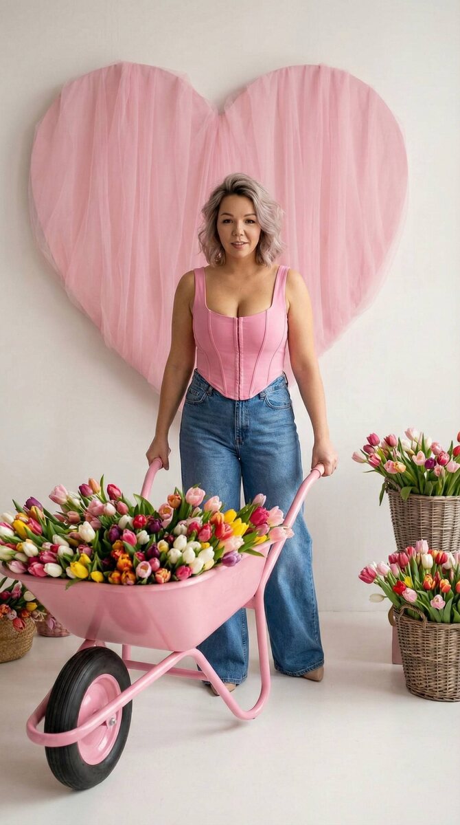 👇🏻 🌟Переходим на удобный сервис для генерации: Ссылка 👉 Syntx Ai Ссылка 👉 Veo3 📌ИНСТРУКЦИЯ ПО ИСПОЛЬЗОВАНИЮ В ЗАКРЕПЛЕННЫХ СООБЩЕНИЯХ ◾️ПРОМТ : Не меняй черты лица Кинематографический портрет девушки, стоящей в светлой студии. Она стоит в середине кадра и толкает большую садовую тачку розового цвета которая заполнена полностью тюльпанами разных цветов. Она одета в розовый корсетный топ с глубоким декольте. Голубые широкие джинсы Волосы короткие, цветом как на фото, но густые, с объемом у Корней, лёгкие волны. Взгляд в камеру. Лёгкая улыбка. На фоне нее на стене висит огромное сердце драпированное полностью нежно розовым сетчатым фатином. Рядом стоят корзины с тюльпанами Освещение студийное Формат 9:16