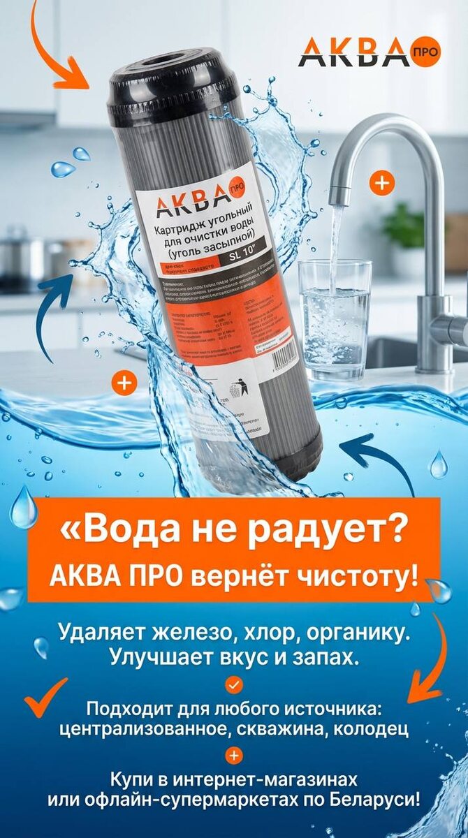 Система дополнительной очистки от АКВА ПРО вернёт воде чистоту и свежесть! 🌊 ✅ Удаляет железо, хлор, органику ✅ Улучшает вкус и запах ✅ Подходит для любого источника: централизованное водоснабжение, скважина, колодец Купите картриджи или корпус для фильтра в интернет-магазинах или офлайн-супермаркетах по Беларуси! 🔍 Не ждите — пейте чистую воду уже сегодня! 💦 #ЧистаяВода #АКВАПРО #ВодаДома #минск #беларусь