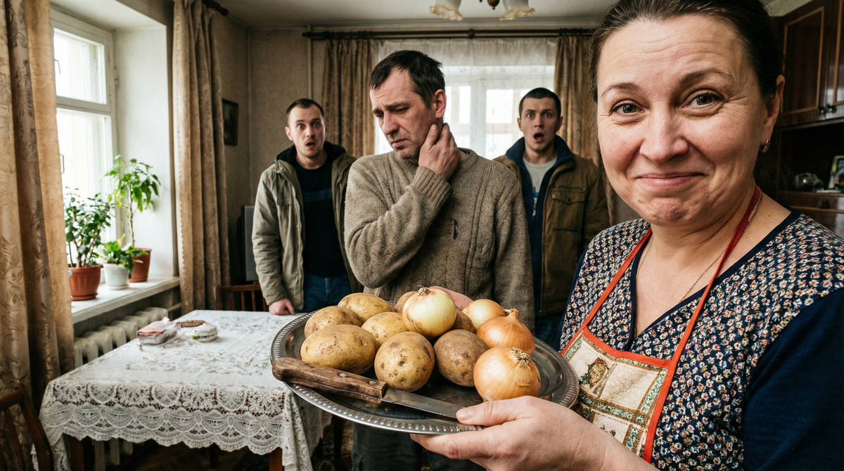 Елена унесла пакет на кухню. Вернувшись, она увидела великолепную картину: трое взрослых мужчин сидели вокруг сырой картошки и молчали. Праздничное настроение улетучилось, как дым.