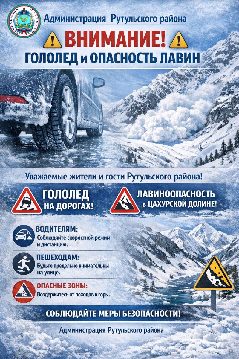 ⚠️ Уважаемые жители и гости Рутульского района! В связи с ухудшением погодных условий на территории района отмечается гололёд, что существенно повышает риск дорожно-транспортных происшествий и травматизма. Кроме того, в Цахурской долине сохраняется лавиноопасная обстановка. Просим воздержаться от поездок и передвижения по потенциально опасным участкам, не выходить на горные склоны и строго соблюдать меры личной безопасности. Рекомендуем: ⚠️ водителям - соблюдать скоростной режим, дистанцию и использовать зимнюю резину; ⚠️ пешеходам - быть предельно внимательными и осторожными; ⚠️ жителям и гостям района - следить за официальной информацией и предупреждениями экстренных служб. 📞 112 📞 Начальник отдела ГО и ЧС Рутульского района - Гасантаев Амир Кардашбалаевич - 8 (988) 799-60-85 Берегите себя и своих близких. Администрация Рутульского района