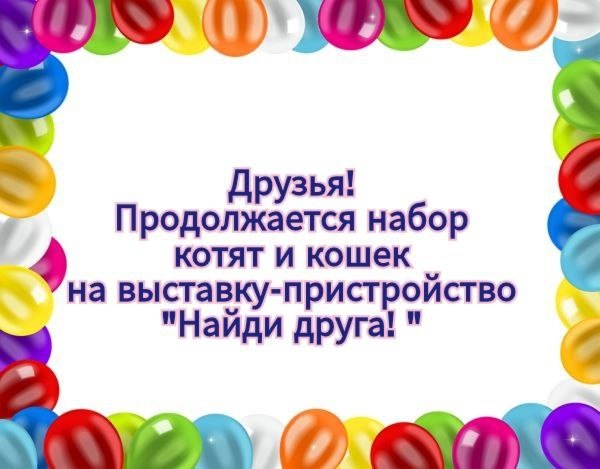 Москва. Московская область. Организатор выставок «Найди друга». Центр защиты животных АНО «ГБР.Зоозащита» открывает набор кошек и котят на выставку-пристройство «Найди друга». 🔷Выставка будет проходить 14 февраля, с 12 до 20 часов, в ТЦ Калейдоскоп по адресу: Москва, Сходненская 56 1 минута от метро🚇 Сходненская ❗Заявки принимаются до 11 февраля включительно. Набор может быть окончен заранее! Не верно заполненные заявки рассмотрены не будут! Ответ о рассмотрении заявки ожидайте не ранее 12 февраля. Если ответ не поступил, значит заявка не одобрена. Кураторы привозят свои клетки для кошек! Количество мест ограничено! Заявки принимаются на почту gbr.findfriend@ya.ru. 1 животное - 1 письмо В теме письма: Выставка 14 февраля кошка «кличка» В самом письме: 1. ФИО, телефон куратора (телефон должен быть с приложением телеграмм и открытым номером для добавления в чат выставки) 2. Кличка кошки, возраст (не дата рождения) 3.Количество клеток для всех кошек которых планируете везти на выставк
