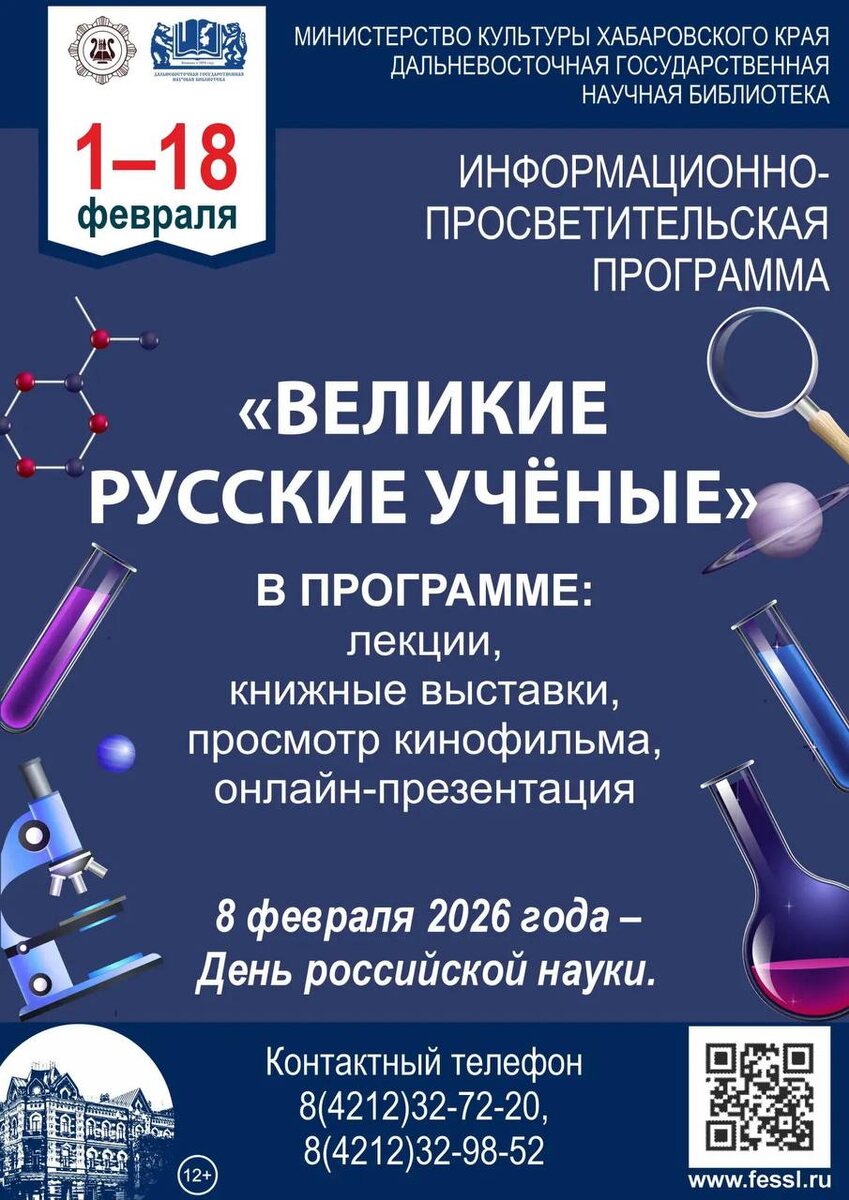 ✔ Просмотр фильма «Россия − лаборатория мира» в Региональном центре Президентской библиотеки #11_февраля ✔ Лекция «Радиоволны, изменившие мир» #11_февраля ✔ Лекция «Выдающиеся ученые-защитники Отечества» #18_февраля ✔ Книжные выставки с тематическими подборками «На радиоволне», «Дело науки − служить людям», «Талантов россыпь − гениев полёт», «Наука − двигатель прогресса», «Великие русские учёные» #8_февраля — #15_февраля ✔ Презентация «Во всех науках мы сильны» на сайте библиотеки #8_февраля ⛳ Где: ул. Муравьёва-Амурского, 1 💳 Вход свободный 📞 Контакты: +7 (4212) 32-63-67; +7(994) 099-13-41 👉 Афиша Хабаровска. Куда сходить, экскурсии