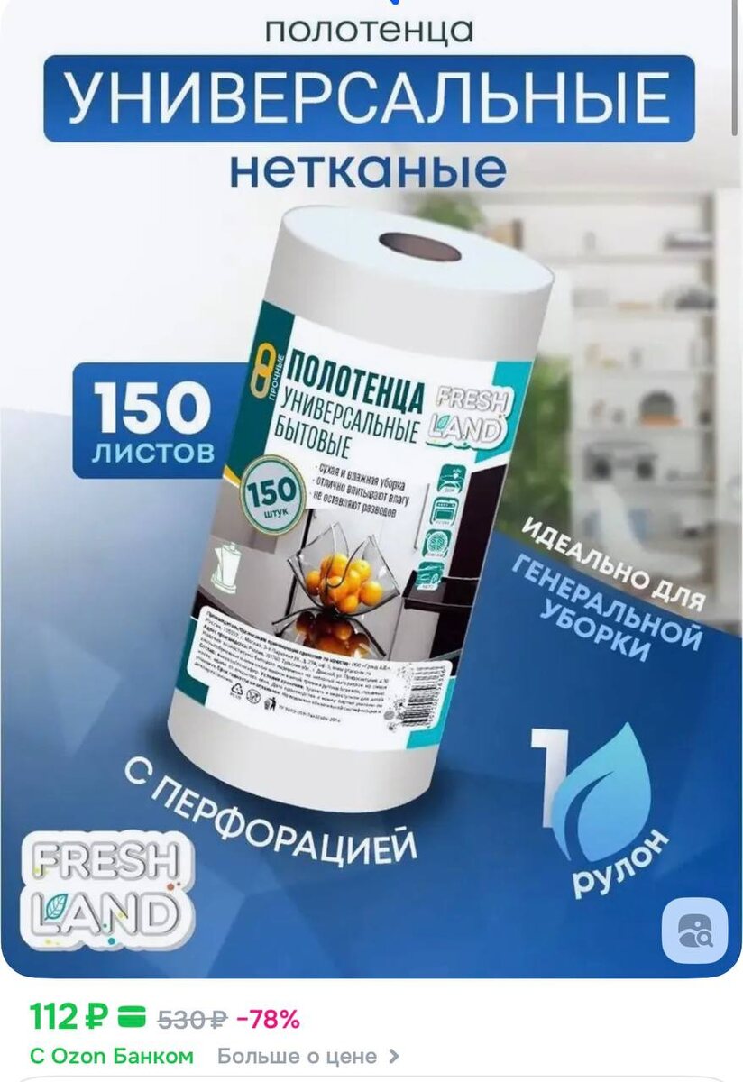 😀😀😀FRESHLAND Универсальные салфетки для уборки в рулоне с перфорацией, 20х23 см, 150 шт