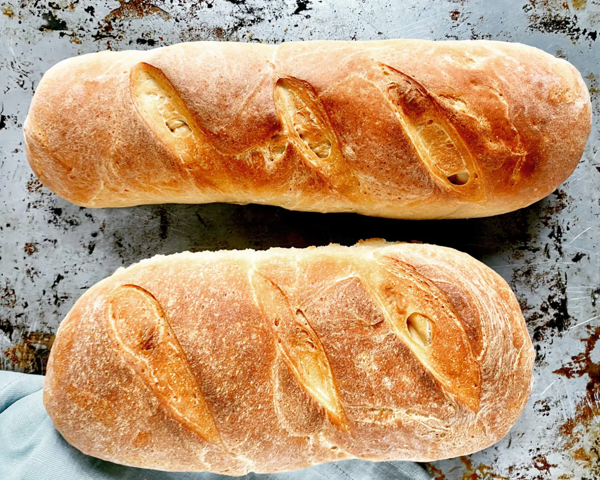 Французский хлеб можно испечь менее чем за два часа, что является огромным преимуществом. 2 стакана теплой воды 1 столовая ложка сухих дрожжей 2,5 чайные ложки сахара 650 гр. пшеничной муки, плюс немного еще по необходимости 2,5 чайные ложки соли 2 чайные ложки растительного масла растопленное сливочное масло - по желанию 1. В миске смешайте воду, дрожжи и сахар, отставьте на несколько минут, пока дрожжи слегка не вспенятся. 2. В чаше кухонного комбайна (я предпочитаю замешивать тесто с помощью кухонного комбайна с насадкой-крюком для теста) смешайте 2 стакана муки с солью. Добавьте дрожжевую смесь, постоянно помешивайте на низкой скорости, добавляя по 1/2 стакана оставшейся муки за раз, пока не получите нужную консистенц