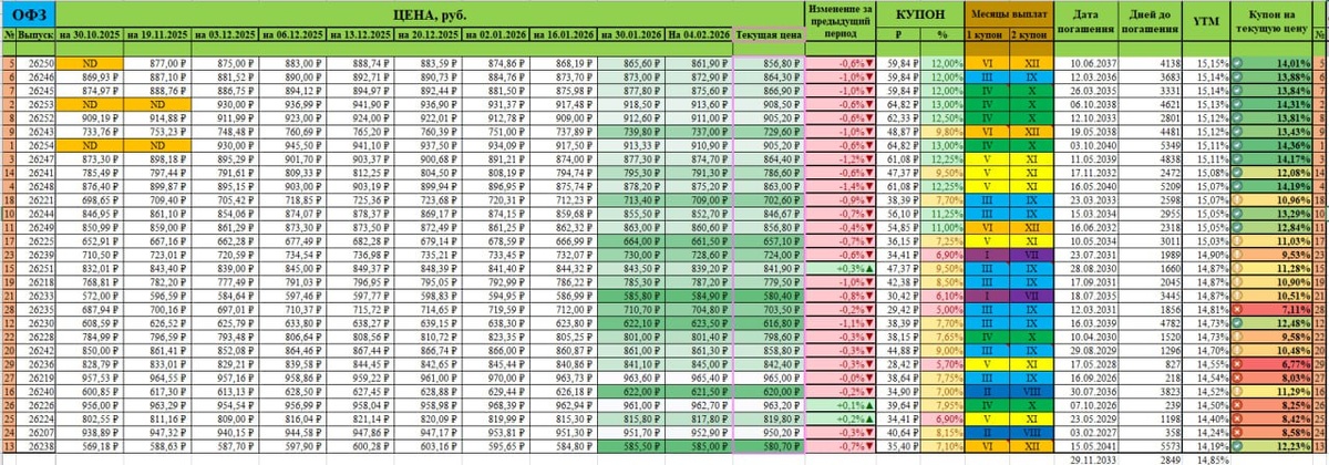 ✔️ ОФЗ — самый надежный инструмент среди долгового рынка. Позволяющий зафиксировать приемлемую доходность на длительный срок. В аналитику попали только выпуски с фиксированным купоном ОФЗ 262ХХ.