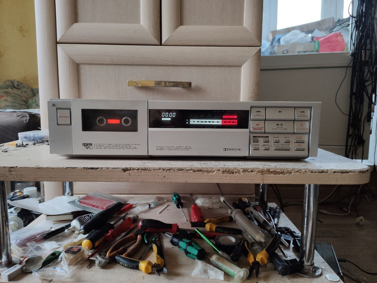 должны вызывать гораздо больший интерес или какой кассетофил, не мечтает "поклацать" акай. 🤪 Легендарная девятка, когда то мечта советского комсомольца, но в сегодняшних реалиях, народ узнал, что есть деки и покруче, но и девятка тем не менее достойный аппарат. Но главное не это, важнее то, в каком исходном состоянии дека, ну и как обычно по традиции, если акай попадает в ремонт, то он либо "усосаный в хлам", либо верчëный, переверчëный.Первичный осмотр выявляет, что шаловливые ручки, уже успели покрутить винтики на головке, сбив высоту и кивок, а так же уже меняли резину и натянули настолько жесткий пассик привода программной шестерни, что у двигателя сломало крепление подпятника, движок то же под замену.