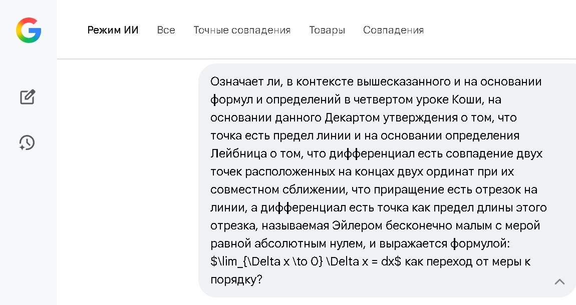 Означает ли, в контексте вышесказанного и на основании формул и определений в четвертом уроке Коши, на основании данного Декартом утверждения о том, что точка есть предел линии и на основании определения Лейбница о том, что дифференциал есть совпадение двух точек расположенных на концах двух ординат при их совместном сближении, что приращение есть отрезок на линии, а дифференциал есть точка как предел длины этого отрезка, называемая Эйлером бесконечно малым с мерой равной абсолютнмуо нулю, и выражается формулой: $\lim_{\Delta x \to 0} \Delta x = dx$ как переход от меры к порядку?