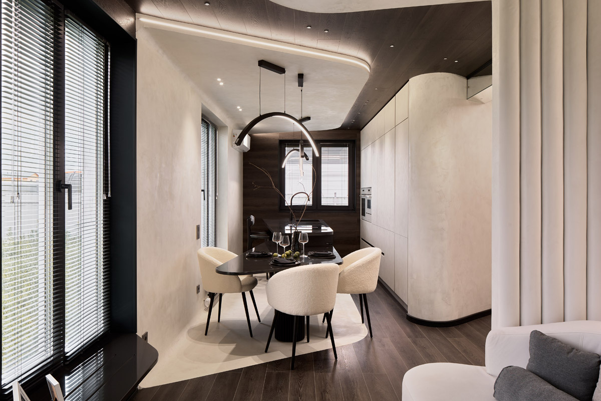 кухни-гостиной, вдохновленный героиней, которая влюблена в небо и полеты. Пространство получилось лёгким, плавным, с обтекаемыми формами и минимумом прямых углов. Интерьер напоминает кабину самолета или даже космическую капсулу. Проект разработала студия дизайна и архитектуры BALKA.STUDIO. Чтобы поддержать концепцию и подчеркнуть архитектуру пространства, мы изготовили кастомные светильники, предоставили новинки собственной