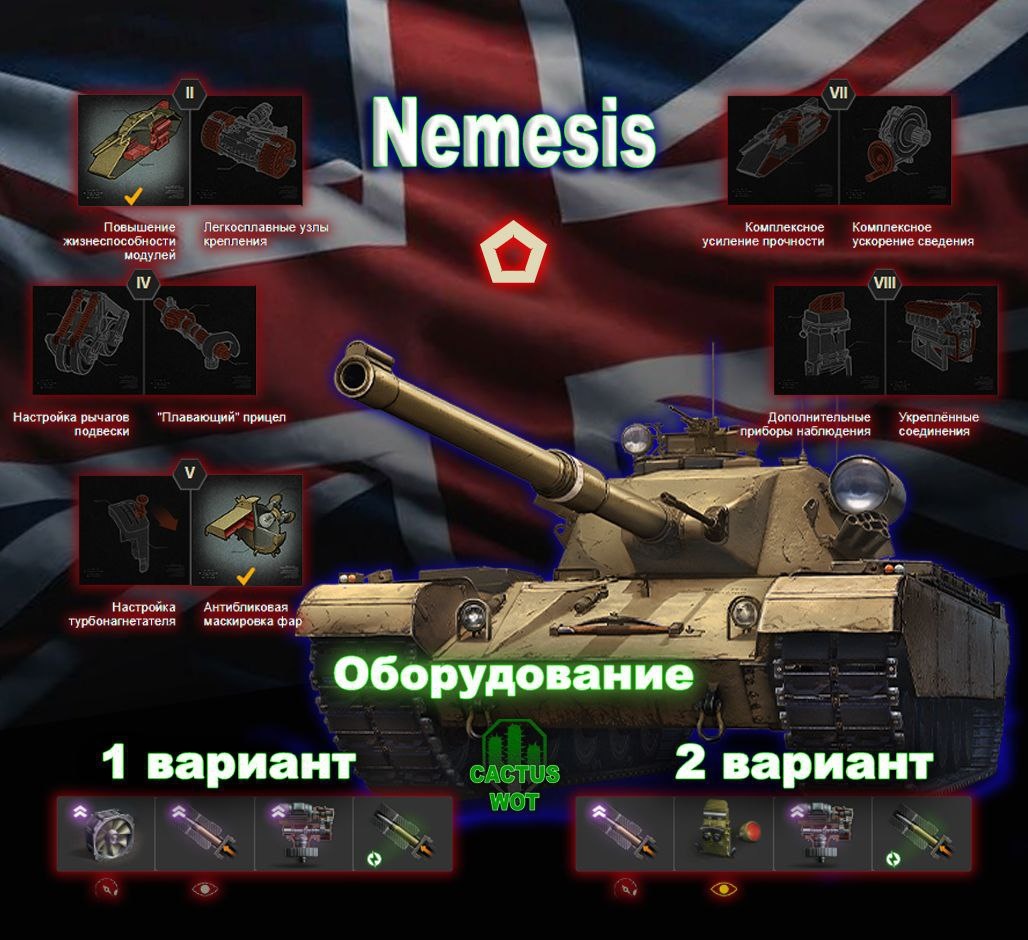 🏥Средний танк штурмовой 10 уровень. Великобритания. 🔼Полевая модернизация на картинке🔼 ТТХ: Калибр (мм)110 Урон (ед.)510 / 430 / 430 Бронепробиваемость (мм)230 / 330 / 240 Скорострельность орудия (выстр/мин)5.26 Заряжание орудия (с)11.40 Скорость гориз. перевода прицела (град/с)44 Углы поворота башни (град)180 / 180 Углы вертикальной наводки (град)-8 / 20 Время сведения (с)2.10 Разброс на 100 м (м)0.34 Средний урон в минуту (ед/мин)2684.21 Боекомплект (шт.)60 Живучесть 426 Прочность (ед.)1950 Бронирование корпуса (лоб/борт/корма в мм)135 / 80 / 60 Бронирование башни (лоб/борт/корма в мм)300 / 60 / 60 Время ремонта ходовой (с)12.03 Мобильность 532 Масса (кг)40100 Мощность двигателя (л. с.)940 Удельная мощность (л. с./т)17.24 Макс. скорость / задний ход (км/ч)45 / 20 Скорость поворота шасси (град/с)55 Незаметность 241 Неподвижной машины (%)0.24 В движении (%)0.18 Наблюдение 622 Обзор (м)410 Дальность связи (м)700 ➕Плюсы: Высокий разовый урон базового фугасного снаряда (510 единиц).