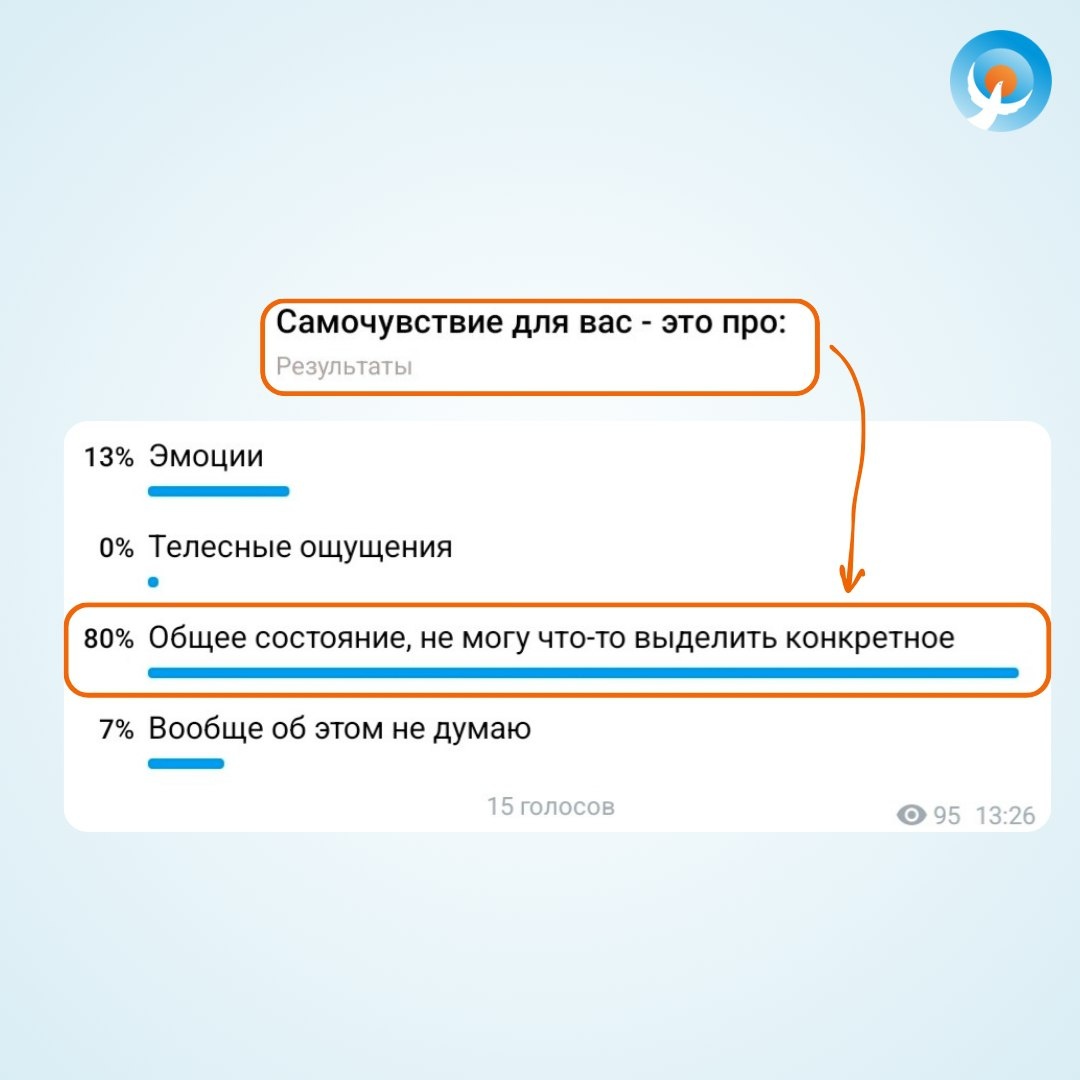 Самый популярный ответ (80%!) на вопрос «Что для вас «самочувствие»?» был таким: "Общее состояние, ничего конкретного". К сожалению, эта цифра подтверждает нашу статистику. Большинство людей, которые обращаются к психологу, в процессе терапии очень быстро обнаруживают, что не замечают своего состояния. Такое автоматическое функционирование. Пока что-то не начинает "сбоить" и беспокоить. Именно поэтому в обучающих программах Академии КСП упор делается на телесно-ориентированной подход. Работать только с мыслями, игнорируя сигналы тела — всё равно, что пытаться наладить сложный механизм, отстраивая только пульт управления. Наше тело живое и говорящее, даже если мы привыкли не слышать его. Усталостью, болью, напряжением или, наоборот, лёгкостью и силой, оно первым сообщает о том, что с нами происходит. Научиться слышать эти сигналы, понимать их и через тело влиять на свое общее состояние —один из самых мощных навыков и для личного благополучия, и для профессиональной практики психолог