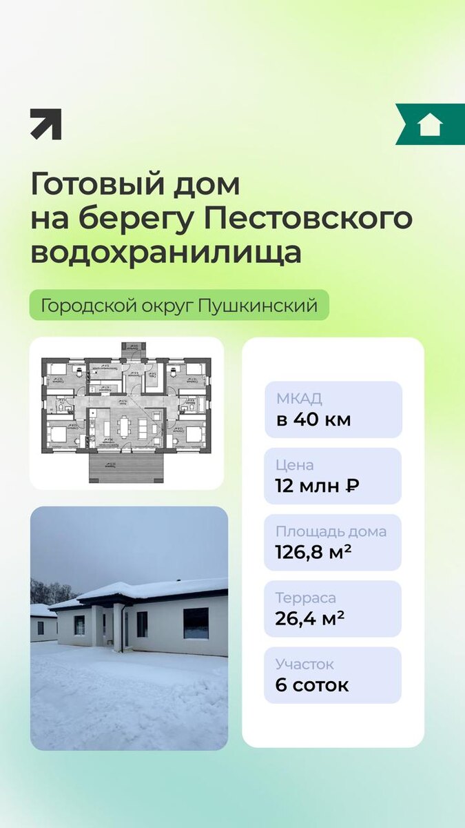 🔼В новых домах: • Одноэтажная планировка дома на монолитной плите, 4 жилые комнаты, кухня, гостиная, 2 с/у и бойлерная • 126,8 м² основного пространства и ещё 26,4 м² террасы • Теплый контур с внешней отделкой • Стены из газоблока, сохраняющие комфортную температуру в любое время года Дома располагаются на участках площадью 6 соток в центре поселка. 🔰Право собственности на дома зарегистрировано, адрес присвоен, собственник — ИП, семейная и любая ипотека с государственной поддержкой возможны Стоимость базовая, без отделки: 12 млн ₽ Есть возможность отделки: - white box + к базовой стоимости ~ 1 800 000 ₽ - чистовая + к базовой стоимости ~ 2 700 000 ₽ #realtone #готовыедома