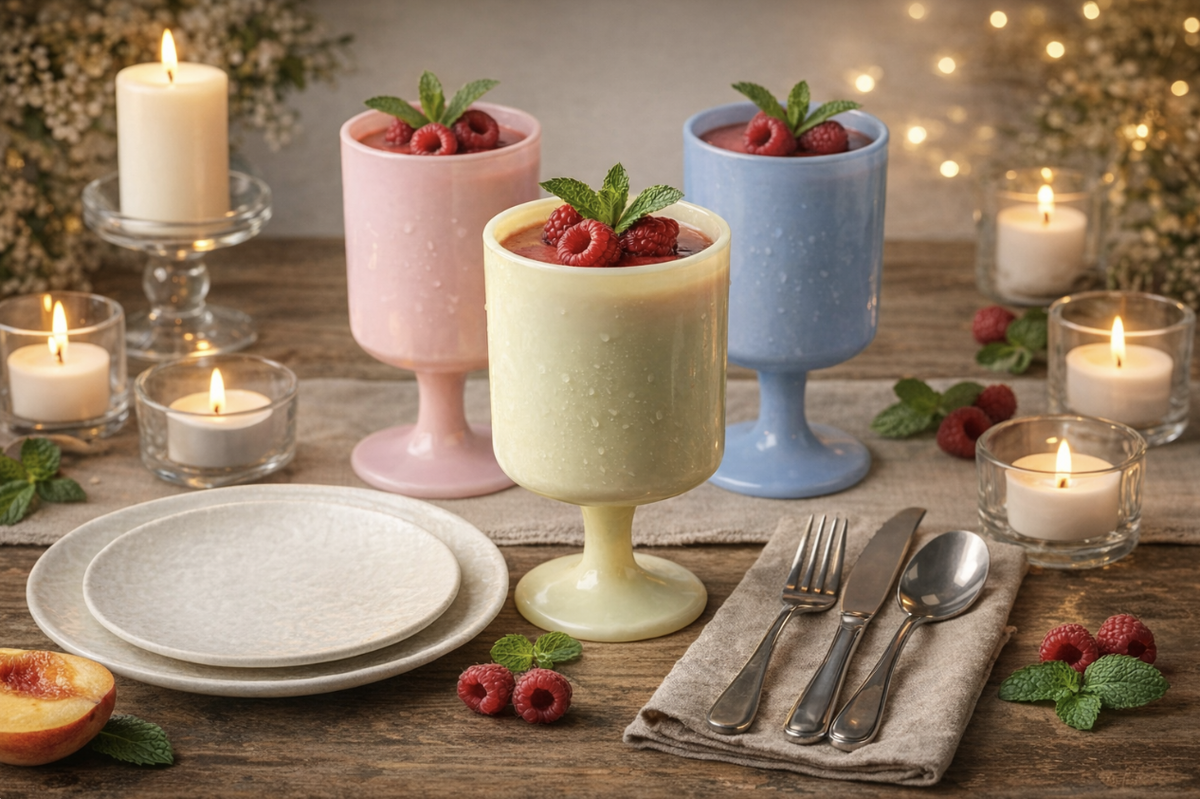 В 2026 году напитки снова становятся частью визуальной концепции стола. Цветные графины и бокалы добавляют глубины сервировке и создают ощущение продуманного образа. Особенно эффектно такие наборы смотрятся при вечернем освещении.