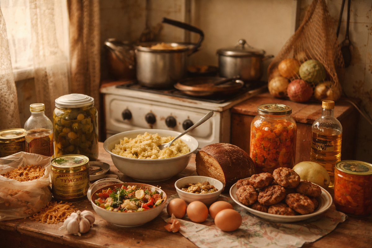 Советская кухня формировалась не на витринах и не в ресторанах. Её основой стала повседневная жизнь обычных людей. Магазины с ограниченным выбором, очереди, сезонные продукты, домашние заготовки. Всё это напрямую влияло на то, что и как готовили. Еда в СССР редко была изысканной, но почти всегда была сытной и понятной. Она решала главную задачу — накормить семью в любых условиях. Дефицит не был одинаковым для всех и всегда. В разные годы и в разных регионах ситуация отличалась. В крупных городах продукты появлялись чаще, в провинции — реже. Но общее ощущение нехватки знакомо многим. Продукты не просто покупали — их «доставали». Это слово хорошо передаёт суть процесса. Нужно было знать, где и когда «выбросят» товар, постоять в очереди, иногда обменяться или купить с запасом. Историк и кулинар Вильям Похлёбкин писал, что советская кухня сложилась под влиянием ограниченного ассортимента и привычки экономить продукты. Это подтверждают и воспоминания людей. Рацион строился не вокруг рецепта