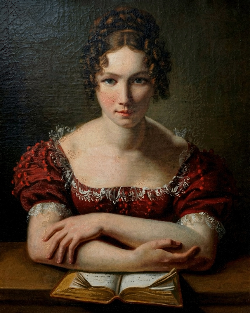 Спокойно и уютно сложены руки милой барышни, милое у нее лицо, искренний взгляд больших серых глаз, легкая полуулыбка на розовых губах. И очень красивое платье! Не знаю, можно ли назвать его домашним – с таким декольте и такого вкусного ягодного цвета с тончайшими кружевами. И прическа тоже красивая – модная, но скромная. ___ Картина находится в музее-заповеднике «Дмитровский кремль», так что художник, по всей видимости, русский и дама на портрете – тоже.