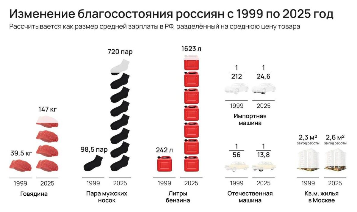 Приветствую вас, друзья! Сегодня разберем не цены на квадратный метр, а наш общий уровень жизни. В сети появилась любопытная аналитика от Росстата— давайте оценим ее не только как экономику, но и как инвесторы в недвижимость. Раньше vs. Сейчас: что можно купить на одну среднюю зарплату? Цифры, от которых глаза округляются: 🥩 Говядина: было 39.5 кг → стало 147 кг (в 4 раза больше!) 🧦 Носки: было 98 пар → стало 720 пар (это на всю жизнь, кажется!) ⛽️ Бензин: было 242 л → стало 1623 л (можно кататься постоянно)Но это «малая ликвидность». А что с главными активами? 🚗 Автомобили: Их на дорогах стало в 2.5 раза больше (с 132 до 331 на 1000 человек). Машина — не роскошь, а норма. Это важно: люди сначала покупают машину, потом часто задумываются о гараже или доме с парковкой. 🏡 КВАРТИРЫ — главный индикатор! Здесь прогресс ошеломляющий: жилье стало доступнее примерно в 10 раз по отношению к доходу.