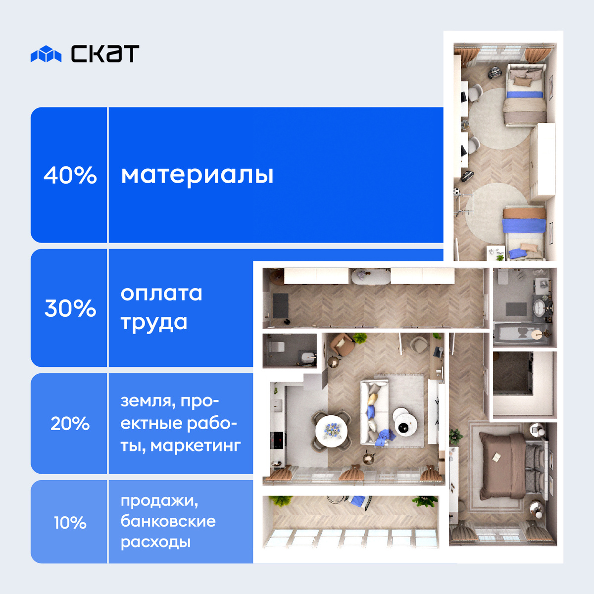 Уделите нам 5 минут, и узнаете, почему квартира столько стоит. Девелопер получает деньги так: строит дом, продаёт квартиры и забирает разницу. Цена квартиры складывается из составляющих, которые можно разделить на две большие группы. Строительство. Сюда входят: покупка земли и её подготовка; проектно-изыскательные работы; подготовка проекта; качественные строительные материалы; внедрение современных архитектурных решений; аренда, покупка и обслуживание парка техники; прокладка инженерных сетей; отделка мест общего пользования. В случае СКАТа, сюда необходимо добавить ещё и весомую строку по благоустройству территории: игровое и спортивное оборудование; геопластика; многоуровневое освещение; разнообразные материалы покрытия; богатое озеленение. И, что немаловажно, сюда же входят зарплаты сотрудников и найм подрядчиков; все связанные с этим налоги и отчисления. Финансы. Это траты на банковское обслуживание; субсидирование ипотечной ставки для повышения её доступности; социальная нагруз