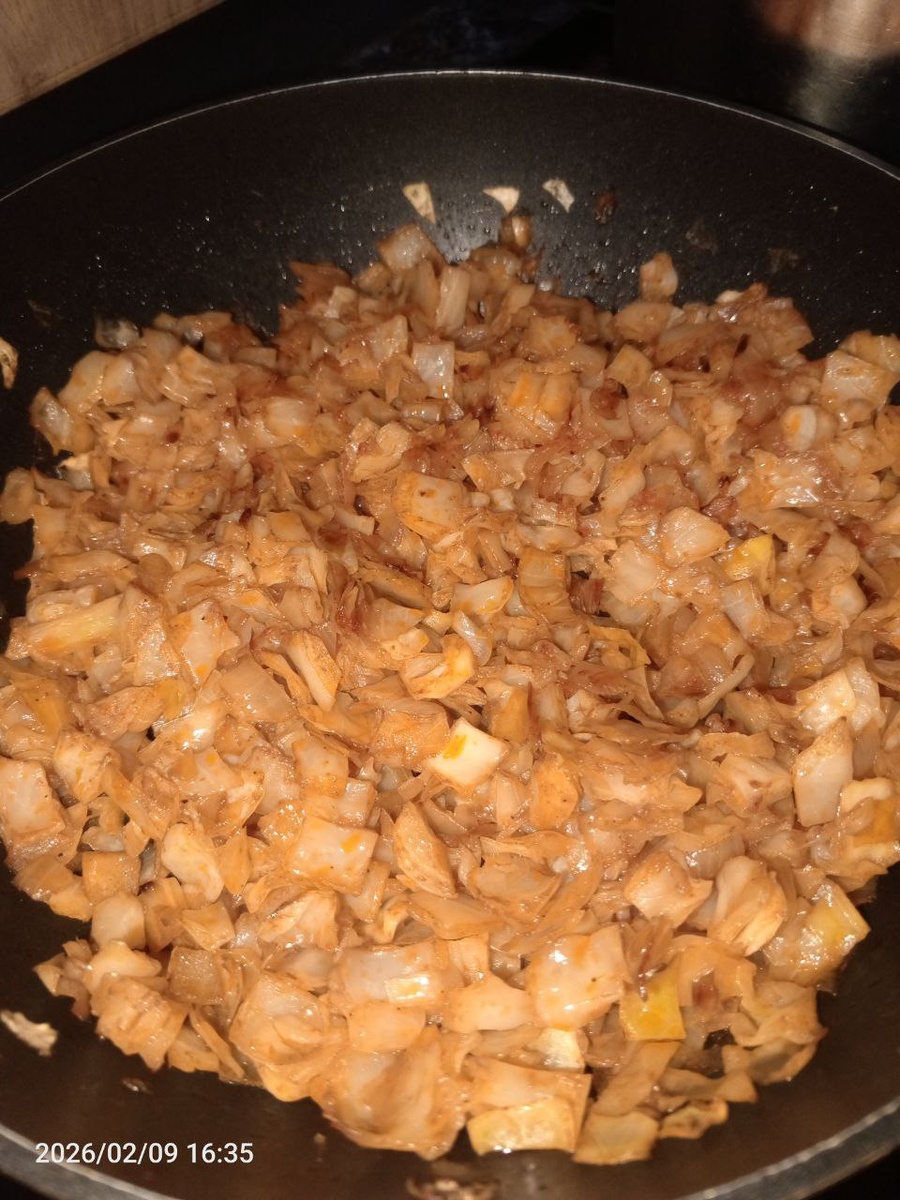 Помните тот неповторимый аромат из бабушкиной кухни — когда дом наполняется запахом свежих пирожков? Сегодня я поделюсь с вами рецептом сочной тушёной капусты, которая превратит обычные пирожки в маленькое гастрономическое чудо. Готовы окунуться в атмосферу уюта и вспомнить вкус детства? 1) Начинаем с капусты! Нарезаем её ножом или пользуемся шинковкой. Потом ещё чуть измельчаем ножом — нам не нужны слишком длинные кусочки. Перекладываем в миску, заливаем крутым кипятком из чайника, ждём пару минут и сливаем воду. Вуаля! Горечь ушла, и в процессе тушения нам не придётся добавлять воду — очень удобно! Лук нарезаем кубиком. 2) Пора заняться луком! Отправляем его на сковороду и обжариваем, не забывая помешивать. Ждём, пока лук потеряет свою яркость и станет прозрачным — вот тогда можно двигаться дальше! 😉 3) Капуста, твой выход! Отправляем её к луку, добавляем жару (увеличиваем огонь) и жарим без крышки минут 10. Пусть овощи подружатся: капуста станет мягкой и нарядной (желтовато‑розово