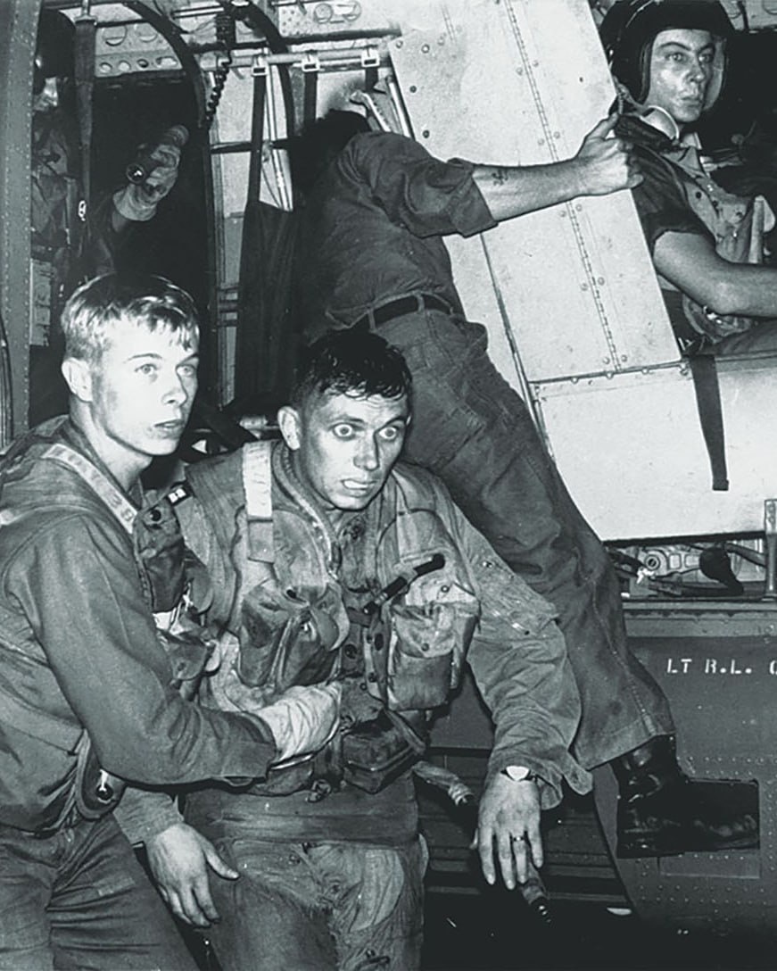 Чего уже только не понаписали про этот снимок в соцсетях. И пилот, которого только достали из плена во вьетконговских джунглях. И десантник, который видит, как его самолет врезается в гору и разбивается. На самом деле это он на корабле. Просто он не ожидал, что будет на корабле. Капитан Виктор Визкарра был одним из тех, про кого «Чиж & Co» поют народную песню «Фантом». Он совершал жестокие налеты на Северный Вьетнам, во время одного из которых его и подбили. Был ли это русский ас Иван или отважные вьетконговские зенитчики, история умалчивает. Но, так или иначе, потом все было, как в «Фантоме»: «катапульта — вот спасенье, и на стропах натяженье». В итоге Визкарра оказался вниз головой на дереве в 2 м над землей посреди джунглей. Дальше повезло. Он смог спрыгнуть вниз, отбежать в сторону открытой поляны, где его могли бы подобрать, и спрятаться, заблаговременно вызвав помощь по рации. Так что ему не довелось идти по проклятой земле, пока сзади дулом автомата тыкали ему солдаты. Вертол