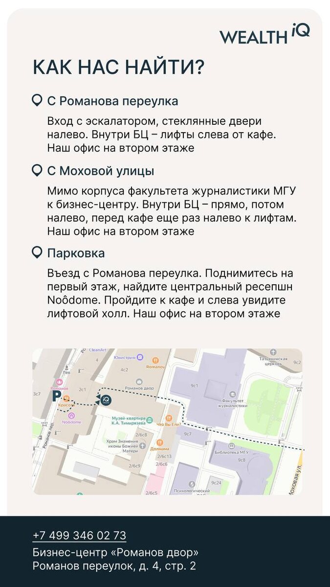 В офисе на первом этаже бизнес-центра «Романов двор» мы проработали почти три года. В 2025-м московская команда значительно увеличилась, мы стали искать пространство побольше. И, к счастью, нашли в том же здании в Романовом. Поэтому с радостью сообщаем, что ждем вас в гости по тому же адресу: Романов переулок, дом 4, строение 2, но теперь на втором этаже. Мы уже переехали. Первым в новый дом, конечно же, запустили кота ♥️ 🏦 @wealth_iqs