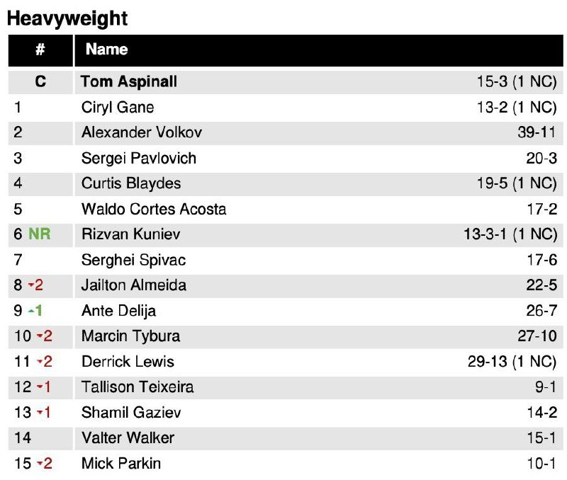 🆕 Ризван Куниев влетел на шестое место рейтинга тяжелого веса UFC 🆕 Дастин Джейкоби попал в топ-15 полутяжелого веса UFC ⬆️ Киоджи Хоригучи попал в топ-5 наилегчайшего веса UFC ⬆️ Марио Баутиста поднялся на одну позицию рейтинга легчайшего веса UFC ⬇️ Жаилтон Алмейда потерял две позиции рейтинга тяжелого веса UFC 👊 Подпишись на Meta MMA | Meta MMA в MAX | Наш канал в ВК
