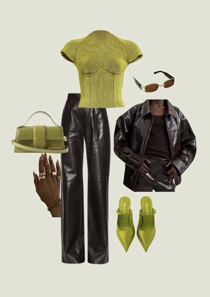Главный приём — цветовой удар в паре с фактурой. Лаймовый оттенок мгновенно делает образ весенним и свежим, а кожа отвечает за структуру и статусность. Силуэт построен логично: укороченный верх подчёркивает талию, прямые брюки вытягивают ноги, а объёмная кожаная рубашка добавляет модную «небрежность» и балансирует пропорции.