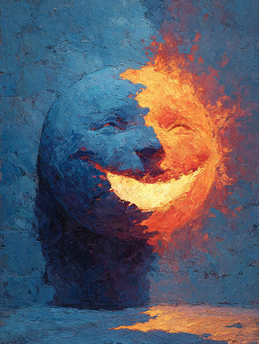 A masterpiece oil painting of a joyful sun-and-moon sphere split between molten orange flames and icy blue frost, wide smiling with surreal charm. Rich impasto textures and expressive brushstrokes, dramatic cinematic lighting with golden-hour rim highlights, deep dynamic shadows, tactile detail on fire, ice and glossy surface, warm palette with cool accents, painterly realism, minimal background, ArtStation quality. --ar 3:4 --s 750 --style raw --v 7