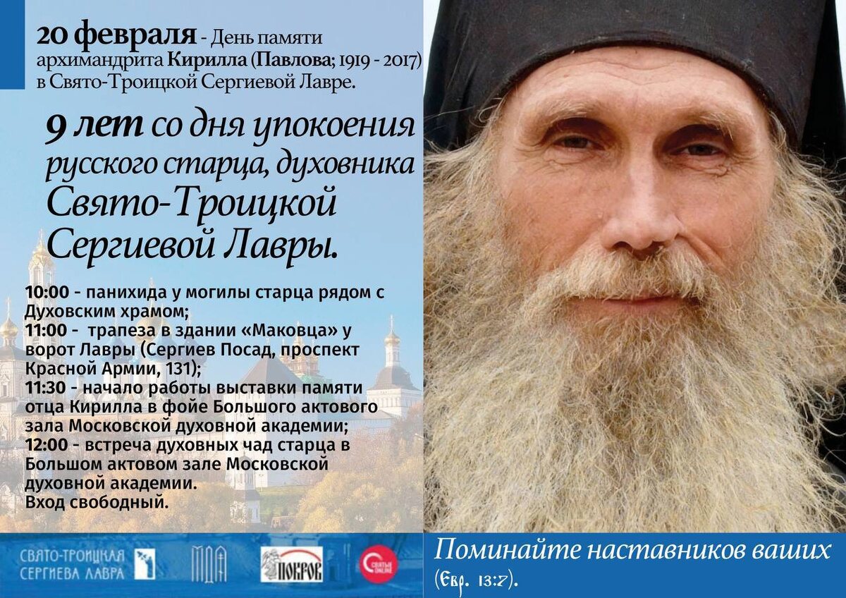 20 февраля 2026 года, в пятницу на Масленичной неделе, исполняется 9 лет со дня преставления ко Господу архимандрита Кирилла (Павлова; 1919-2017), русского старца, принимавшего исповедь трех Патриархов, многолетнего духовника Свято-Троицкой Сергиевой Лавры.