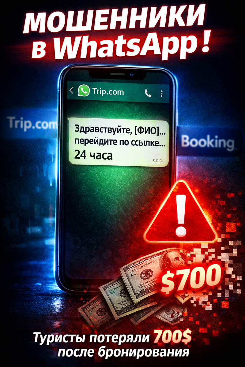 Турподборки кажутся безопасными, если вы бронируете через Trip.com или Booking - но мошенники уже научились использовать чужую доверчивость, отправляя «официальные» сообщения в WhatsApp и выманивая сотни долларов у туристов за несколько дней до отпуска. В статье разберём новую схему с фальшивой проверкой брони, расскажем, по каким признакам распознать развод и что делать, если деньги уже перевели. На первый взгляд всё кажется безупречным: отель из списка Trip.com, чистые отзывы, бронь подтверждена, в приложении всё отображается правильно. Казалось бы, можно расслабиться и уже не проверять каждый контакт. Но именно это расслабление и становится золотой жилой для мошенников. Не так давно в сети появились истории туристов, которые после бронирования отеля получили сообщение в WhatsApp с виду "официального" смысла: "Здравствуйте, [ФИО]. Спасибо за бронирование в нашем отеле [название]. Чтобы подтвердить бронь, перейдите по ссылке. Если этого не сделать в течение 24 часов, ваше бронировани