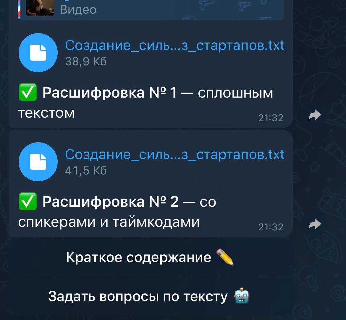 Подкасты, вебинары, записи созвонов, интервью на YouTube. И чтобы найти нужный момент в записи или вытащить полезную инфу, то приходится тратить часы на прослушивание. А ведь часто нужно не просто послушать, а поработать с контентом: проанализировать, задать вопросы, вытащить главное. И тут проблема: ChatGPT и Claude не умеют расшифровывать видео, а Gemini может, но там контекста не хватит, если видео длинное и качество текста не очень. Для расшифровки есть Whisper AI — бот который заточен под это и удобно в тг(всегда под рукой) Видео, аудио, голосовые, любые ссылки из соцсетей — обработает всё. Что по возможностям: ⁃ Получаешь текст с таймкодами, со спикерами и короткой выжимкой ⁃ Поддерживает большие видео до 6+ часов за файл ⁃ Работает по ссылкам: YouTube, VK, Instagram, Facebook, RuTube и др. ⁃ Отдаёт расшифровку в любом формате: Google Docs, Word, PDF, TXT, Markdown Попробуйте, экономит кучу времени: WhisperAI