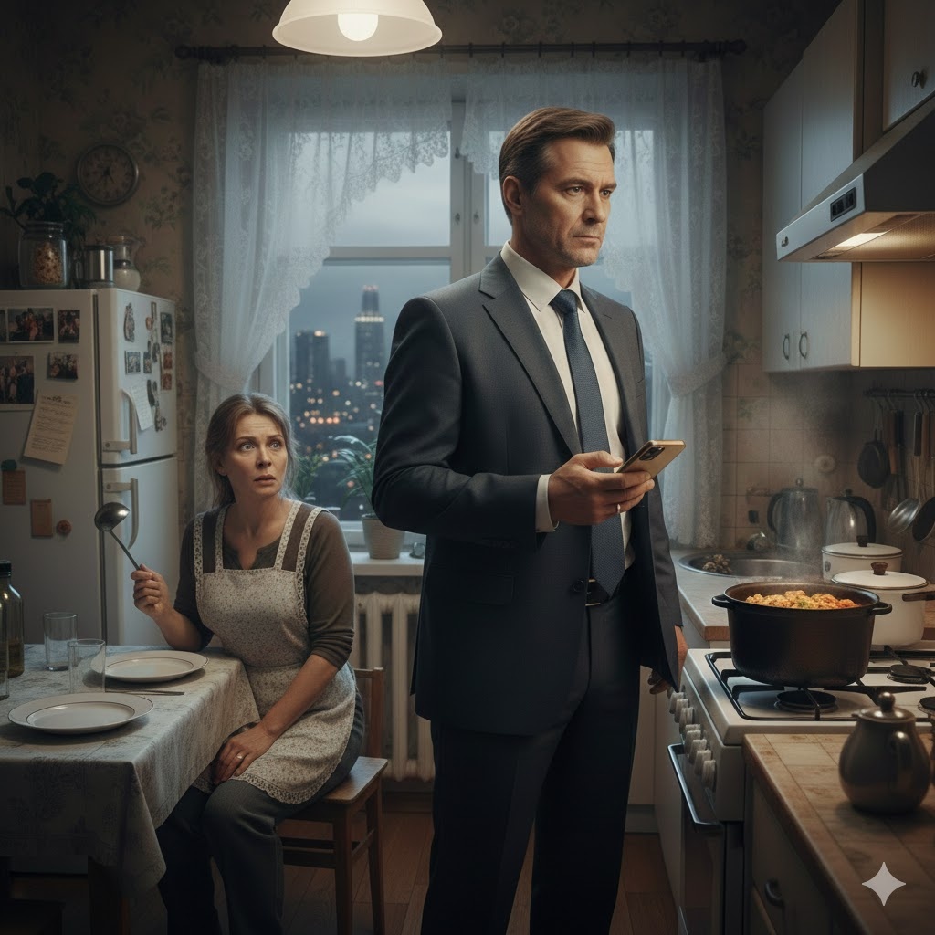 В животе похолодело. Этот тон я знала — так он разговаривал с подчиненными, которые провалили важный контракт. Я послушно опустилась на табурет, чувствуя, как кухонный фартук вдруг стал тяжелым, словно свинцовым.
