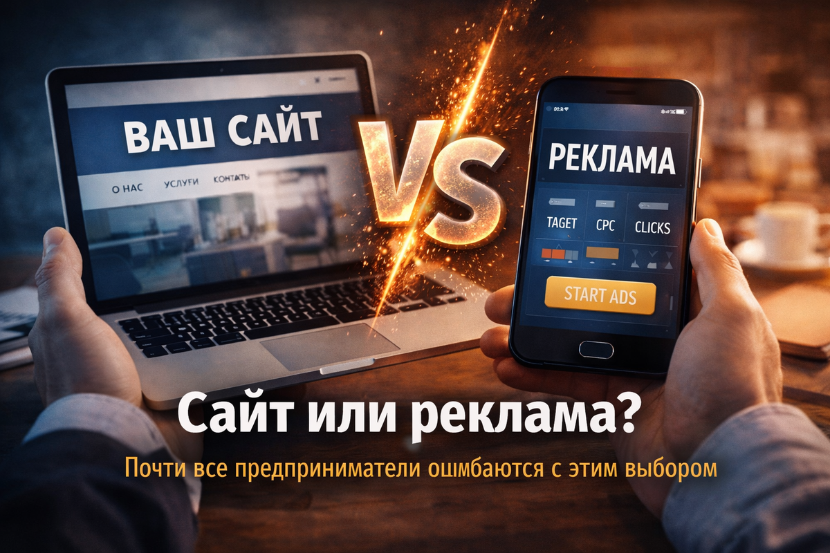 Есть вопрос, который предприниматели задают почти всегда в один и тот же момент — когда деньги в маркетинг уже вложены, а очередь из клиентов почему-то не выстроилась. Вопрос звучит просто: «Что важнее — сайт или реклама?» И каждый раз я понимаю, что проблема даже не в бюджете и не в подрядчиках. Проблема в самом подходе. Люди пытаются выбрать между инструментами, которые по отдельности почти не работают. Покажу на ситуации, которую вижу регулярно. Приходит предприниматель и говорит: «Рекламу запустили, переходы есть, а заявок нет». Открываешь статистику — действительно, интерес со стороны людей присутствует. Объявления кликают, аудитория приходит. То есть реклама делает свою работу — приводит внимание к бизнесу. Дальше открываешь сайт — и быстро становится понятно, где начинается просадка. На первом экране много правильных слов, но нет чёткого ответа, что именно предлагает компания и кому это подходит. Услу