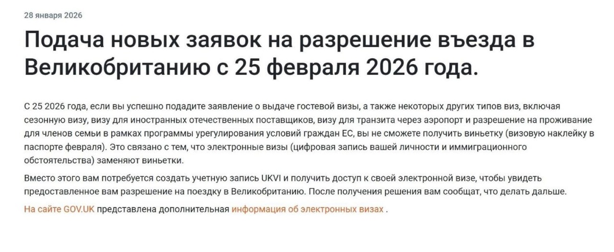 С 25 февраля 2026 года Великобритания начнёт выдавать eVisa вместо традиционных наклеек в паспорт по ряду категорий виз. В этом списке: 🔹Гостевые визы (выдаются в том числе туристам) 🔹Сезонные визы 🔹Визы для иностранных домашних работников 🔹Визы для транзита через аэропорт 🔹Разрешения для членов семьи в рамках программы урегулирования статуса граждан ЕС (EU Settlement Scheme) Что нужно будет делать заявителям? После одобрения визы необходимо создать учетную запись UKVI, через которую можно получить доступ к своей eVisa, проверить условия разрешения на поездку в Великобританию. ❗️ Важный нюанс: Посещение визового центра для сдачи биометрии остаётся обязательным требованием. Что делать, если виза уже есть? Владельцы действующих виз могут создать аккаунт UKVI и привязать к нему свой статус. Через личный кабинет также можно сгенерировать share-код, чтобы доказать свой иммиграционный статус (например, авиакомпании при регистрации). Этот код действителен в течение 90 дней, и для его пол