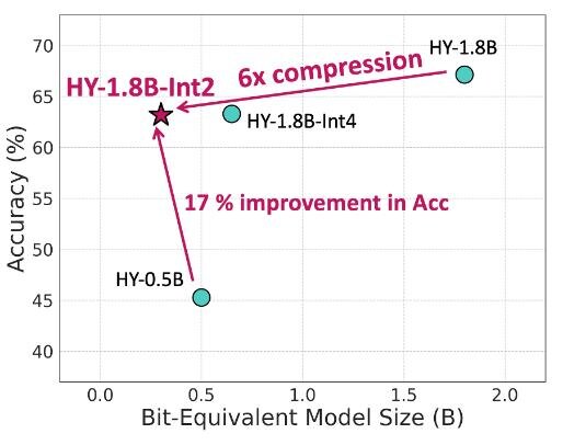 Tencent открыли исходники HY-1.8B-2Bit - сверхэффективной языковой модели, оптимизированной для работы прямо на устройстве. Главная идея — максимально снизить размер без серьёзной потери качества. Что внутри - Базовая модель 1.8B параметров сжата до эффективного размера ~0.3B - Требует всего ~600 МБ памяти — меньше многих мобильных приложений - Подходит для edge-инференса: смартфоны, ноутбуки, встроенные устройства Ключевые технологии - Ultra-Low-Bit (2-bit) — используется Quantization-Aware Training (QAT) - Dual Chain-of-Thought — сохранено сложное рассуждение даже при экстремальном сжатии - Оптимизация под железо — Arm SME2 и современные мобильные чипы Производительность - Prefill: в 3-8 раз быстрее на Apple M4 и MediaTek Dimensity 9500 - Генерация токенов: в 2-3 раза быстрее на устройстве - В среднем +17% точности по сравнению с моделями аналогичного размера Почему это важно Локальные AI-ассистенты без облака становятся реальностью: - приватность - офлайн-работа - низкая задер
