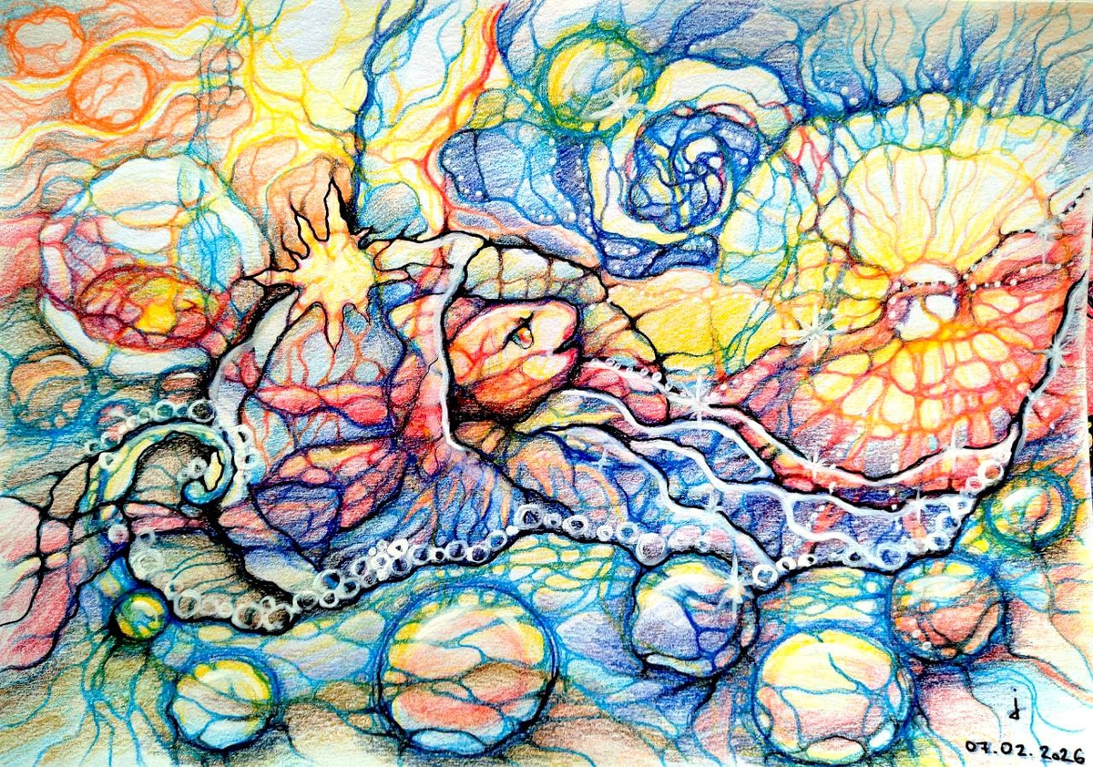 Конкурс #Нейрохудожник37 (присылайте рисунки до 20 февраля в чат телеграм (https://t.me/neurografica) Иллюстрация на текст Светланы Ножкиной: *** Одинокие волны стремяться в объятия моря Разморозка чувств. Жила-была Рыбка в ледяном аквариуме на берегу моря. Когда на море начинался шторм, она радовалась тому, как прочны стены её ледяного убежища, как спокойно ничего не чувствовать. А вот когда другие рыбки стайками собирались на мелководье и весело рассказывали о своих приключениях, где-то глубоко внутри нашей Рыбке становилось одиноко и грустно. Ведь когда-то у неё тоже была жизнь, полная интересных приключений. "Пора выходить", - прошептало Море и ласково обняло своими волнами холодное убежище Рыбки. " Пора! " - согласилась та и со смесью страха и предвкушения радости отправилась по течению вперёд, в глубину Моря. Замораживать свои чувства и выживать привычно. А хочется жить радостно и счастливо, доверяя Миру и своему пути. Моя любовь к рисованию и красоте вытаскивает меня из скорлу