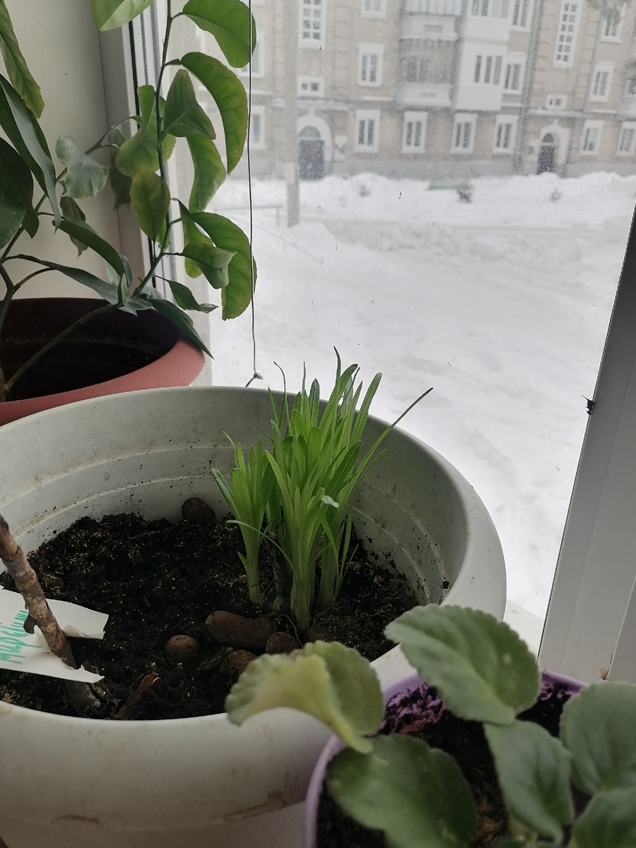 Начало февраля 2026 года. В прошлом году купила луковицу тигридии. Высадила к розам. Она меня не очень впечатлила. Так как было одно растение. Она цвела долго. Белыми мелкими цветочками. Осенью выкопала. Сохраняла в холодильнике. Высадила в горшок в землю в январе. И вот результат через две недели. Надеюсь, что это будет цветение букетом . Наверное, высажу снова в розарий. А пока она развивается быстро на подоконнике без подсветки на западной стороне. Очень интересно, когда она зацветёт?