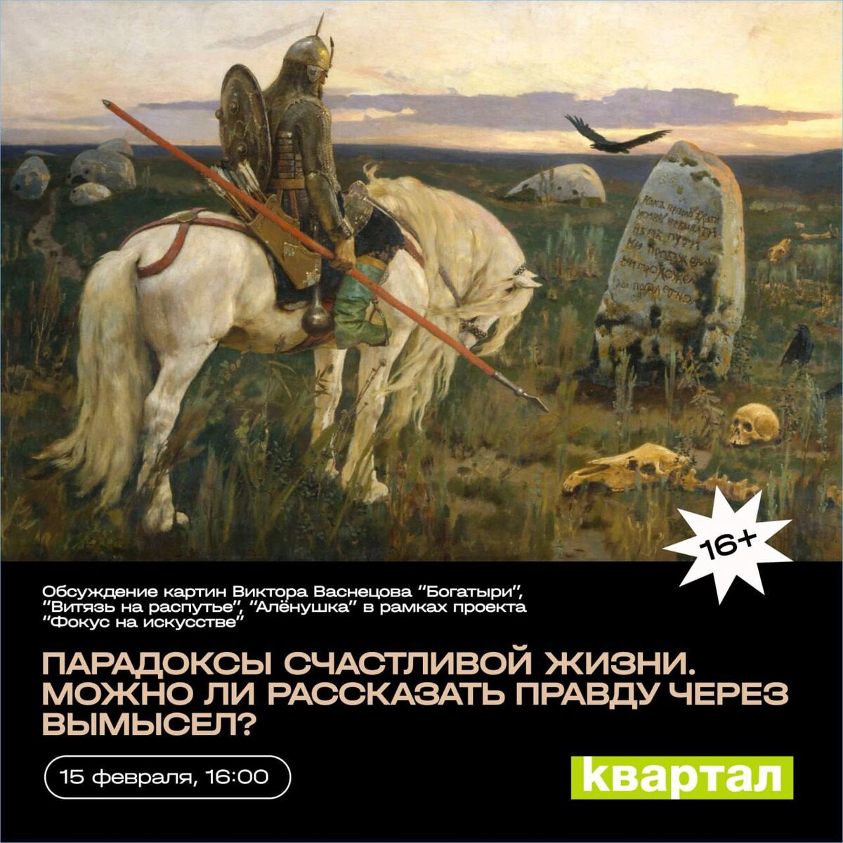 » 🗓️ 15 февраля, 16.00 📍Квартал, Ленина 78 Виктор Михайлович Васнецов (1848-1926) — русский живописец и график, последователь «национального романтизма», один из наиболее знаменитых московских художников времён «контрреформ» и Серебряного века, архитектор и скульптор, общественник консервативных взглядов. Вход свободный 🏷️ #15февраля26@culturnik