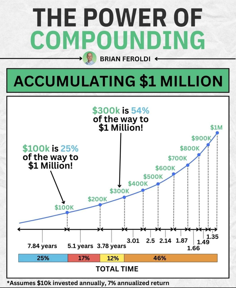 Многие думают, что накопить $1 000 000 — дело неподъёмное. Но если вложить всего $10 000 в год под 7% годовых, картина меняется кардинально. 📊 Вот как выглядит путь к миллиону: 🔹 $100K достигается за 7.84 года — это 25% пути по времени, но уже 10% от цели по деньгам. 🔹 $300K — уже через 16.72 года (25% + 17% + 12% времени), и вот парадокс: это больше половины суммы (54% пути к миллиону). 🔹 А последние $700K копятся за оставшиеся 46% времени — примерно 13 лет. 📈 Почему так происходит? Это магия сложных процентов. На начальном этапе деньги растут медленно — вы копите в основном за счёт своих собственных взносов. Но со временем ваши инвестиции начинают приносить доход, который тоже инвестируется, и этот доход сам начинает приносить доход. В итоге: • 25% пути занимает 7.84 года • Следующие 12% — ещё 3.78 года • А последние 46% роста происходят в последние ~13 лет Вывод: самое важное — начать раньше. Каждый год промедления стоит вам десятков тысяч долларов в конечном итоге. Время — ед