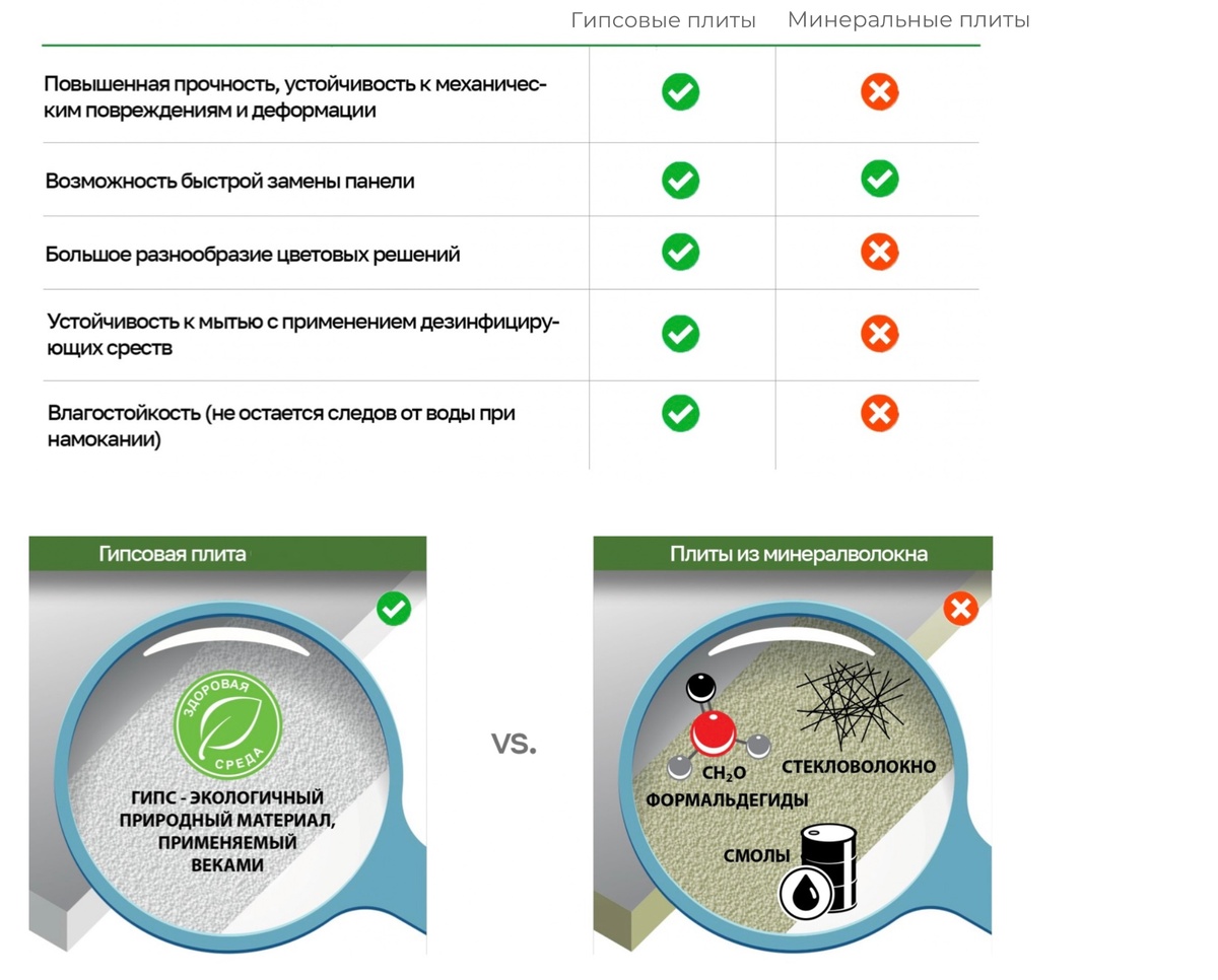 На смену обычным минеральным потолкам пришло более современное, экологичное и надежное решение — плотные, окрашенные в любой цвет влагостойкие плиты из гипсокартона. Панели для подвесных потолков Гипсколор предназначены для помещений с сухим и нормальным влажным режимом, где необходим доступ к запотолочному пространству. Выпускаются плиты в стандартных размерах 600х600 мм и 600х1200 мм, монтируются на стандартный каркас для минеральных потолков Т-24. Каждую панель можно легко изъять и поменять. В сравнении с минеральными потолками плиты Гипсколор имеют ряд преимуществ: 1. Повышенную прочность особенно отмечают монтажники. Они гораздо меньше подвержены механическим повреждениям в процессе перевозки и монтажа. Они не обламываются, на поверхности не остается царапин, как это бывает с минеральными плитами. Такая система будет более долговечной. 2.Разнообразие цветовых решений делает такие потолки настоящей находкой для дизайнеров. Вы можете заказать такой потолок в заводской окраске в