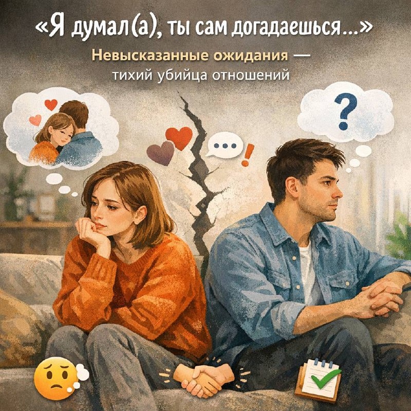 !🤓 💭 «Я думал(а), ты сам догадаешься…» Невысказанные ожидания — тихий убийца отношений Есть фраза, после которой в отношениях часто становится немного холоднее: «Я же думал(а), ты сам поймёшь…» Обычно за ней — не злость. А усталость 😔, уязвимость 🫶 и тихое разочарование. Мы правда хотим, чтобы близкие нас чувствовали без слов. ✨ Заметили настроение ✨ Угадали, когда нужна поддержка ✨ Сами предложили помощь ✨ Сами обняли И именно здесь появляется ловушка: ⚖️ ожидания — это не договорённости. 🧠 Ожидание — живёт у нас внутри. 🗣️ Договорённость — это разговор вслух и общее понимание. Пока разговор не случился — каждый остаётся со своей версией реальности. 🌿 Все проходили через такие истории: Она приходит домой после сложного дня 😞 Молчит — и надеется, что он сам заметит усталость и спросит, как она. Он видит напряжение 😶 И решает не лезть, чтобы не сделать хуже. Думает: «Захочет — сама расскажет». Через время — вспышка 💥 — «Тебе вообще не интересно, что со мной!» — «Поч