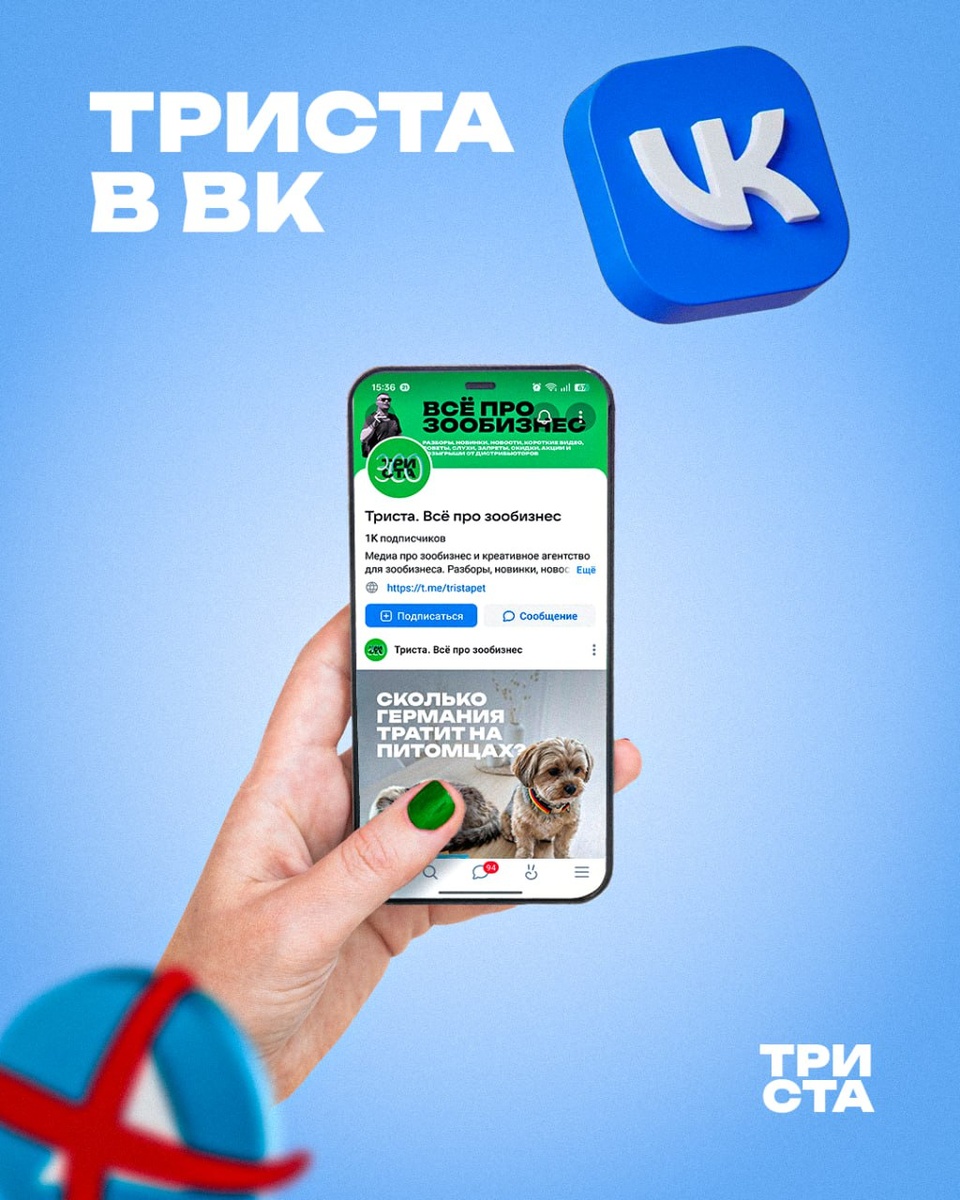На случай, если у вас сломается приложение или вы по неведомым причинам больше не сможете или не захотите заходить в телеграм, у нас есть и альтернативные площадки, где удобно читать про зообизнес. И сегодня напоминаем самый простой вариант из них: мы есть в ВК. Там будет все то же самое, что и в вашем любимом канале «Триста. Всё про зообизнес»: те же темы, тот же взгляд, тот же контент. Новости, аналитика, анонсы и еженедельные рубрики – все появляется там одновременно с каналом. Подписывайтесь! 😀 vk.com/tristapet 😀 vk.com/tristapet 😀 vk.com/tristapet 😀Но это еще не все, в ближайшее время расскажем и о других местах, где есть или совсем скоро появится наш контент! 🐾 Триста. Всё про зообизнес