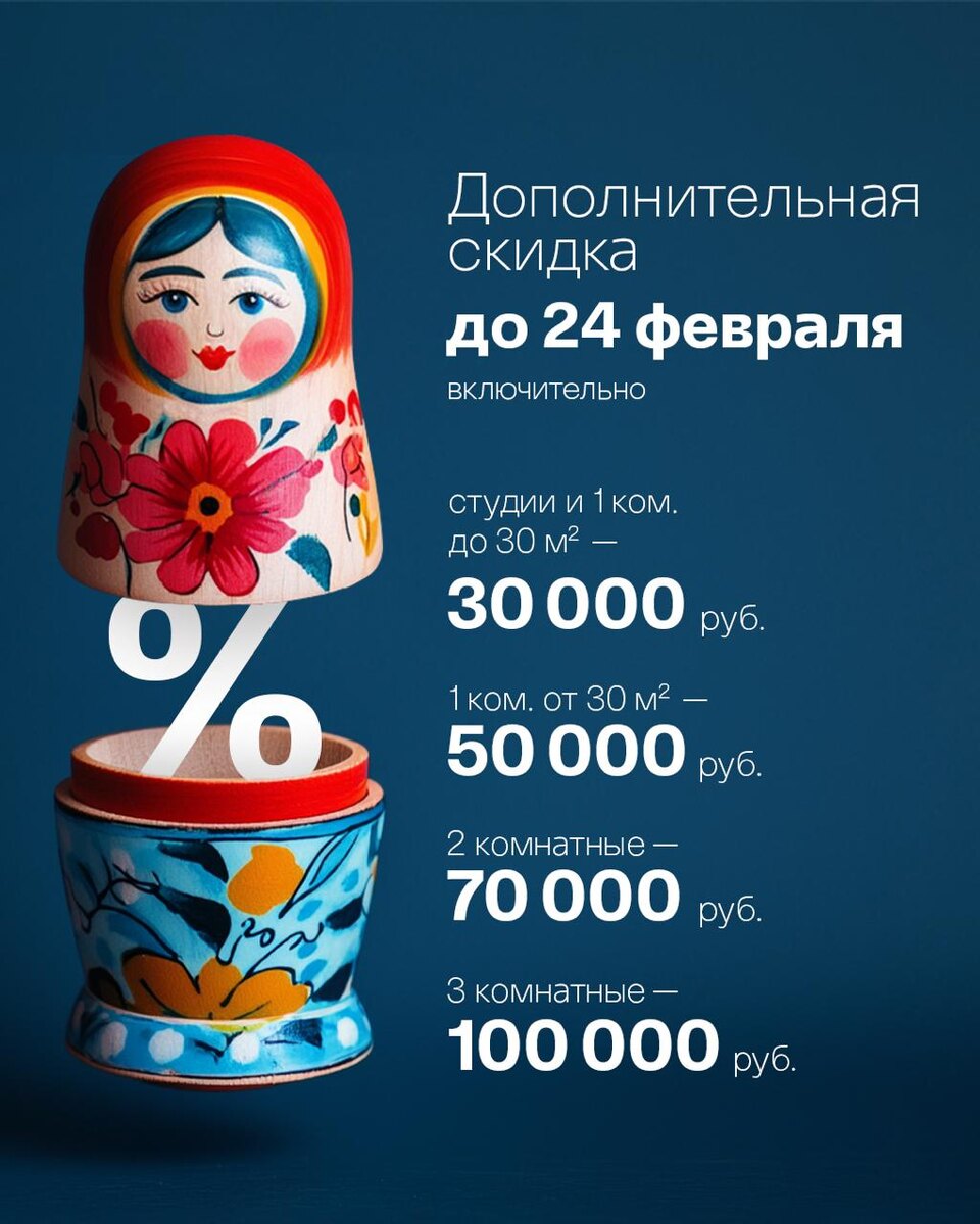 : — Студии и 1-комнатные до 30 м² — скидка 30 000 ₽ — 1-комнатные от 30 м² — скидка 50 000 ₽ — 2-комнатные — скидка 70 000 ₽ — 3-комнатные — скидка 100 000 ₽ Условия действуют во всех ЖК и суммируются с другими акциями, кроме «горячих квартир». Узнайте подробности и подберите квартиру на выгодных условиях прямо сейчас: 📞 +7 (4912) 707-000 🌐 sk62.ru