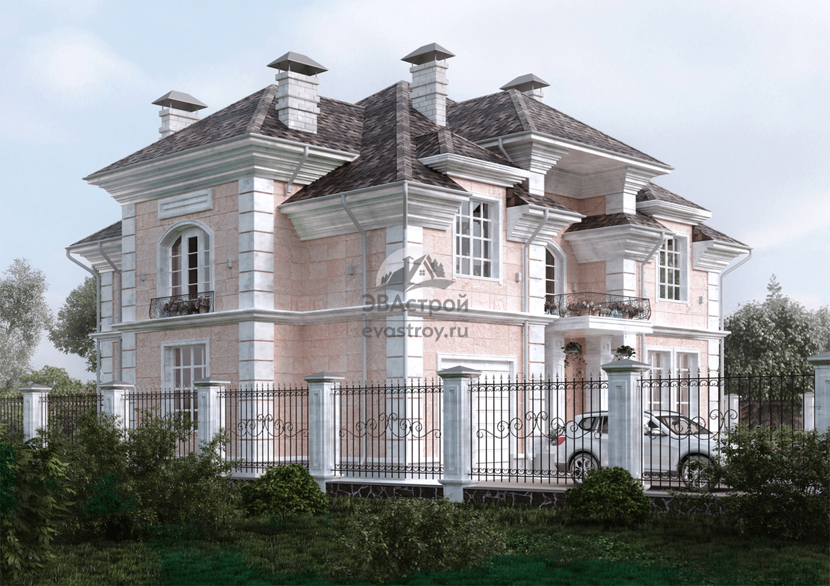 Номер проекта: 106-24 (П-75) Разделы проекта: Архитектурный и Конструктивный разделы Узнать о проекте больше можно на сайте evastroy.ru или по телефону +7 (495) 175-30-40 Этот респектабельный двухэтажный дом органично впишется в структуру элитного поселка. Площадь 460 м2 обеспечит комфортное проживание большой дружной семье, мечтающей об уютном загородном поместье. Он полностью соответствует запросам обеспеченного среднего класса в плане эстетики и функциональности. Примечательные особенности: классическая архитектура с эркерами, колоннами, сложной многоскатной крышей, французскими балконами. Симметричные фасады, создающие ощущение стабильности и основательности. Наличие встроенного одноместного гаража и террасы два габаритных двухэтажных эркера не только формируют пластику фасадов, но также обогащают и усложняют внутреннюю обстановку дома. На обоих этажах в центре помещения расположен лестничный холл; на первом уровне он отделяет общую территорию от гостевой и техпомещений. В дневной