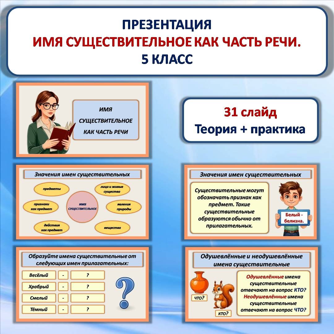 Презентацию скачать здесь Презентация «Имя существительное как часть речи» разработана к уроку русского языка в 5 классе. Презентация состоит из 31 слайда.