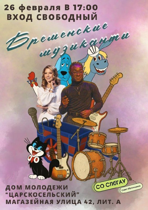 ! Дорогие студенты, преподаватели и сотрудники! Мы приглашаем вас на самое громкое творческое событие этой зимы — премьеру студенческого мюзикла «Бременские музыканты»! 🎸 Наши талантливые ребята доказывают: в аграрном университете рождаются не только профессионалы отрасли, но и настоящие звезды сцены. Будущие агрономы, инженеры и экономисты на один вечер перевоплотятся в любимых героев легендарной сказки, чтобы подарить вам историю о дружбе, свободе и любви. 🗓 Когда: 26 февраля (четверг) ⏰ Начало: 17:00 📍 Где: Дом молодёжи «Царскосельский» (г. Пушкин, ул. Магазейная, д. 42) Вход: СВОБОДНЫЙ! Собирайте друзей, одногруппников и коллег. Давайте заполним зал по максимуму и поддержим наших артистов громкими аплодисментами! 👏