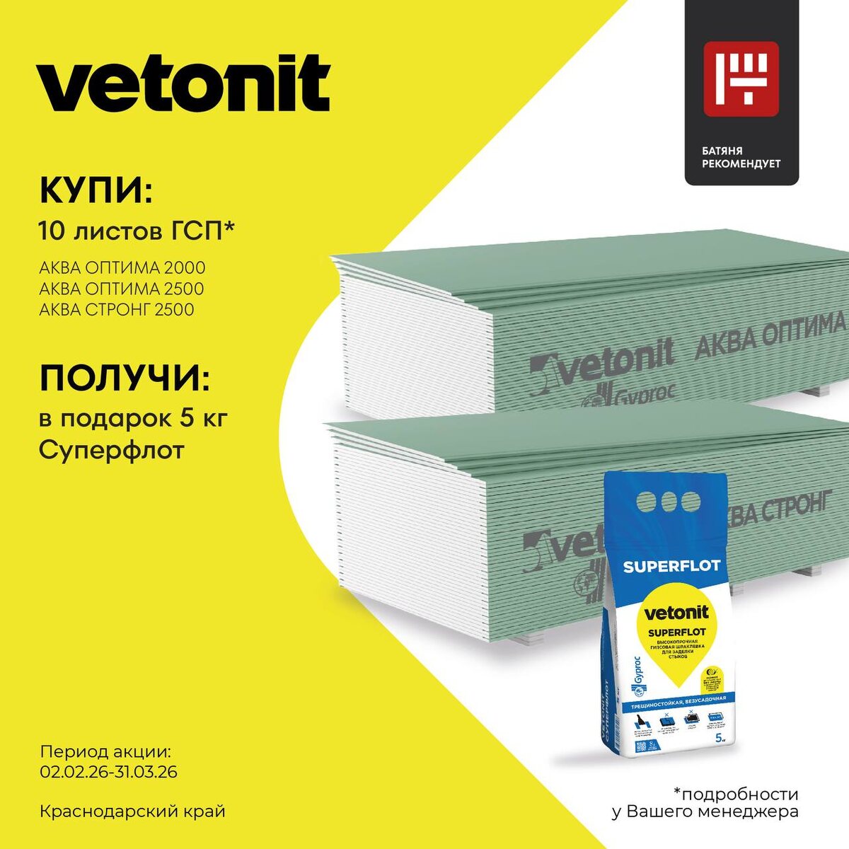 🔥 Купите 10 листов ГСП: — АКВА ОПТИМА 2000 — АКВА ОПТИМА 2500 — АКВА СТРОНГ 2500 Получите в подарок: — 5 кг Суперфлот Период акции: 02.02.26 — 31.03.26. Действует только на территории Краснодарского края.